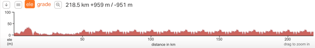 Ud fra profilen ligner det jo nærmest en rute med mange små bakker, men skal man stole på RidewithGPS’s anvisninger vil maksstigning være på 2,6 %, hvilket man finder inde i Nysted by, som er en del af de omgange der skal køres, efter de første 55 kilometer er overstået.