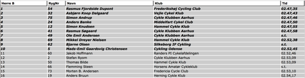 Da vi ramte Yding stod jeg nærmest stille og Oxlund øgede kraftigt. Hvis han satte mig nu, så var det virkelig en større mental udfordring end jeg kunne overskue. Heldigvis ventede han på toppen selvom han allerede der havde taget 10-15 sekunder på mig. Herfra kørte vi ellers bare videre, men pludselig fik Oxlund også en krampe – det var på en måde lidt rart, at han ikke bare var en maskine, men også kunne blive ramt! Han fik den dog hurtigt under kontrol og trak ellers godt til igen. Da vi ramte de sidste 500 meter gav jeg ham hånden, og sagde tak for slæbet, og lod mig falde stille og roligt af. Selvom jeg nok tabte 10 sekunder, så blev den officiele tid ens, af en eller anden grund. Efter målstregen krampede jeg for alvor i baglåret, og kunne ikke klikke ud! Jeg fik trådt igennem én gang, og trillede ellers bare indtil indtil den var ude af systemet! Jeg var helt og aldeles tom!