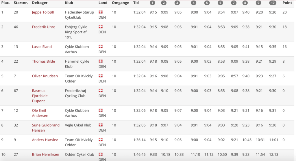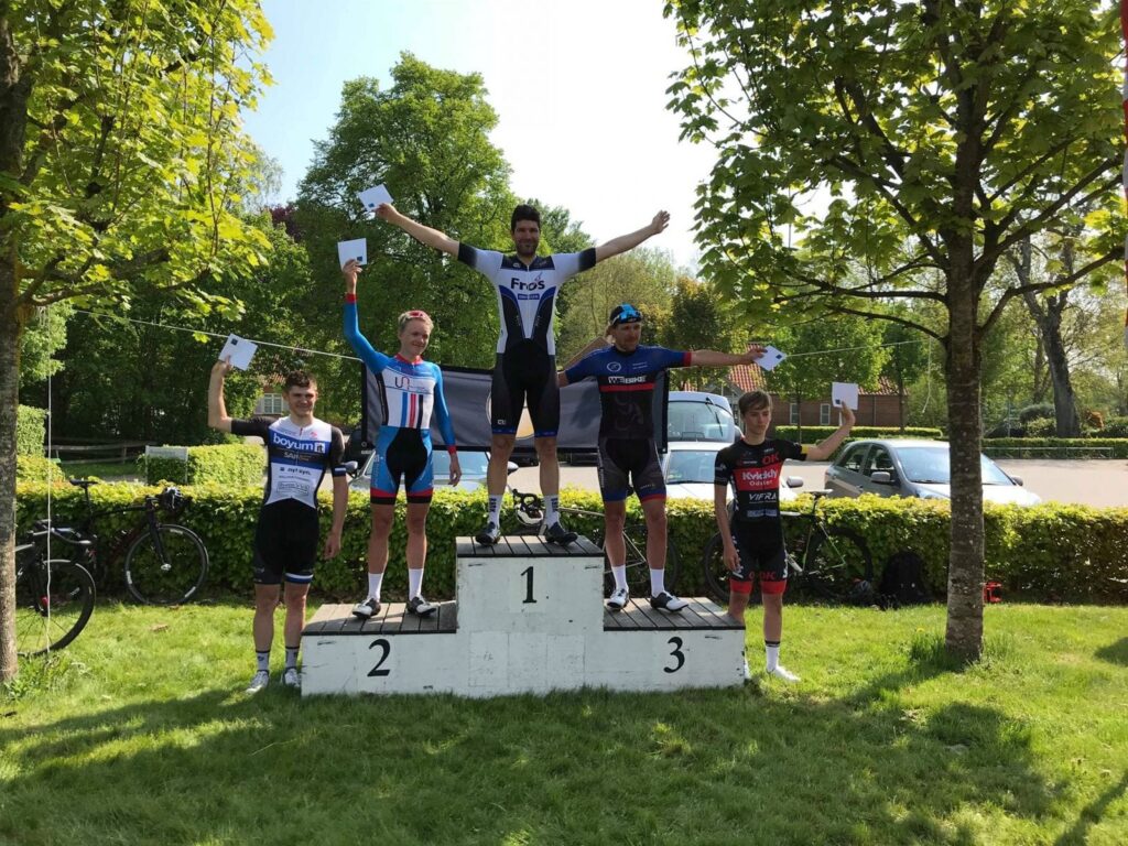 Jeg måtte sætte mig ned, da vejen var ret ujævn, og jeg cyklen hoppede og dansede. Med 100 meter igen så jeg et forhjul ud af øjenkrogen på min højre side, som langsomt åd sig ind på mig! Jeg rejste mig op endnu engang, og trådte det sidste ud af benene, og kunne konstatere at jeg kørte først over stregen til min 3 B-sejr i år. Jeg kom vist til at lave en ret fesen jubelscene, da jeg ikke turde helt at slippe styret. Frederik Uhre blev 2’er, hvilket var vildt imponerende efter den lange spurt han kørte med Ole Andersen. Lasse Eland blev 3’er!