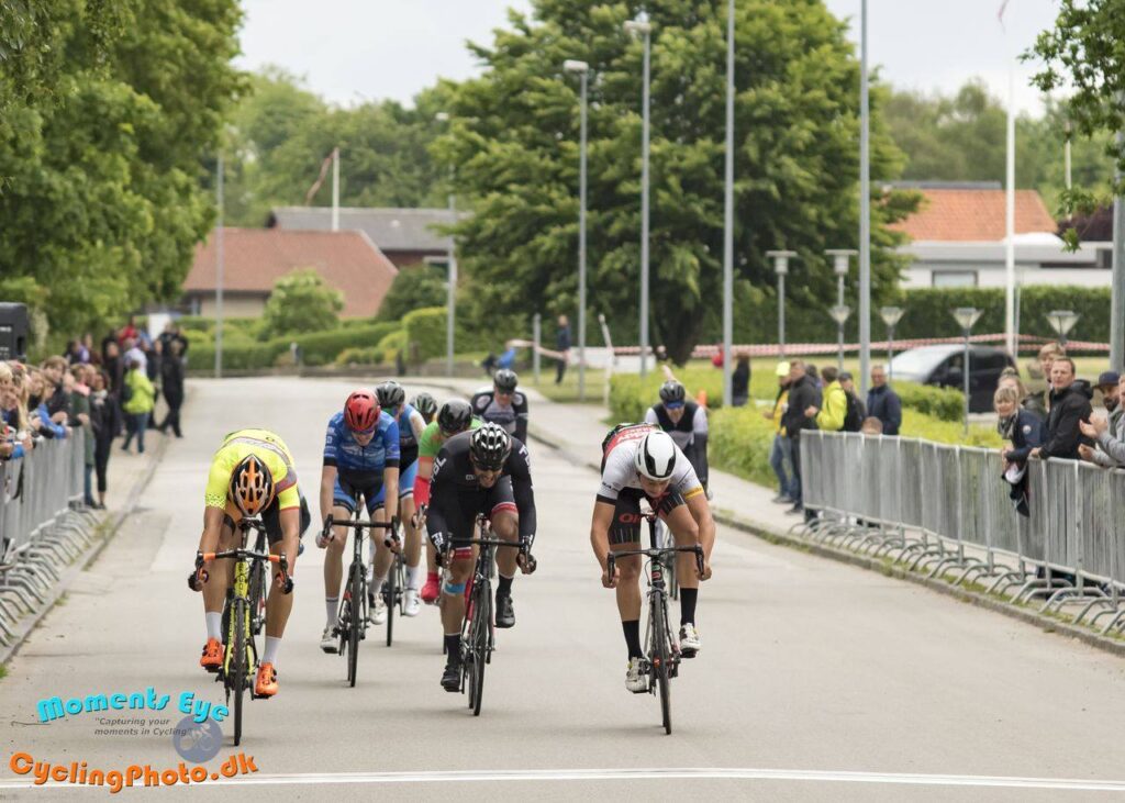 Helt spildt var kræfterne dog ikke da vi fik neutraliseret de 2 udbrydere. Kort tid efter angreb der en mindre gruppe igen. Og da vi var tæt på opløbet, stak Daniel Stampe, Team ACR-FBL Elite, som havde den gule førertrøje, da han vandt løbet dagen før i Silkeborg. Han lukkede dem ret nemt. Jeg syntes, at det så seriøst ud, så da vi kørte ind mod målstregen fik jeg rykket mig fri fra feltet og startede min egen solojagt. Pludselig så jeg Jakob Kruses far, Henrik, stå i vejkanten med dunken. Jeg slog et slag over mod ham, men det var for sent, da jeg havde alt for meget fart på, og fik slet ikke fat i dunken. Nå, øv, men det var heller ikke fordi jeg manglede vand, så der var en chance mere omgangen efter.