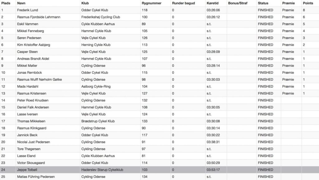 Det endte med en solosejr, hvilket altid er den mest tilfredsstillende måde at vinde på. Da det var et lokalt Syd- og sønderjysk løb, så foregik det uden tidtagning og resultatformidling. Men via Strava Flyby, kunne jeg se, at jeg endte med at slå et hul på 1:30 cirka, så der var virkelig gået taktik i den bagved. Tom vandt spurten om 2. pladsen foran Nikolaj, der nok var ret brugt efter cirka 50 kilometer selv ude foran.