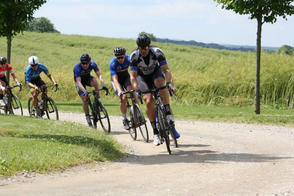 Hvad så nu? Jeg havde en blind passager på hjul, som i sagens natur, ikke ville give mig noget som helst hjælp. Jeg besluttede mig for at køre en fart, hvor jeg ville kunne svare igen på et eventuelt angreb. Jeg accepterede at det højst ville blive til en 3. plads, med lidt held. Vi ramte grusvejen, og jeg talte at de 2 i front havde 10-15 sekunder. Der var ét stykke på grusvejen jeg frygtede, nemlig bakken. Der vidste jeg, at jeg skulle træde nogle watt, som jeg ikke sådan lige umiddelbart ville kunne øge markant. Og så kom angrebet fra Søgaard naturligvis. Søgaard er faktisk MTB’er, og hans punch på det underlag var så hårdt, at jeg ikke havde kræfter til at reagere. Han forsvandt nu også fra mig, og løbet var nu slut, i forhold til podiejagt. Mens jeg kæmpede mig henover den sidste knoldede halvdel af grusvejen, fik Søgaard med lynets hastighed kontakt til hans to klubkammerater i fronten! Hold kæft en røvfuld til mig, og en kold spand vand i hovedet.