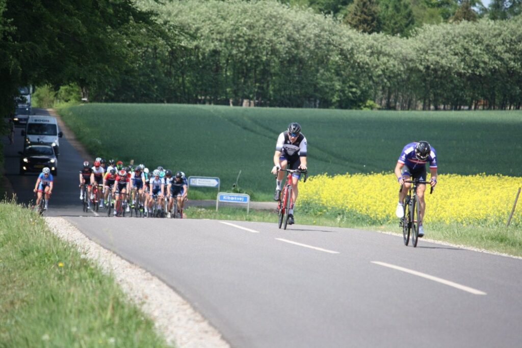 Det var dog lidt sjovt, for vi selvom vi mere eller mindre kun var Ljungdahl og jeg til at føre ordentligt igennem, så holdt vi gruppen inden for en rimelig rækkevidde. Mine tanker begyndte da at kredse om, at hvis de bare gik en smule i stå, så var vi tilbage i løbet. Desværre begyndte de dog til sidst at trække stille og roligt fra os hen mod Pøt Mølle. Vi kunne stadig se dem, men vi kom heller ikke til at fange dem før bakken. På nedkørslen kørte jeg fra mine 2 følgesvende og satsede ned af. I bunden af Pøt Mølle kom jeg med så høj fart, at jeg ville udnytte det momentum og måske øge til de 2 bagved. Men pludselig så jeg Skjellerup og Eland, der var røget fra. Jeg hentede hurtigt ind på dem, og da jeg nåede op på siden af dem, tænkte jeg, at jeg ikke havde noget at miste, så jeg prøvede sgu at angribe. Der gik vel 4-5 sekunder fra at jeg lavede angrebet, til at jeg måtte smide den på lille klinge, og helt ud på 28’ern bagpå. Syren sad i hele kroppen og der var ingen saft tilbage i benene. Jeg måtte rulle op over Pøtten for sidste gang. På toppen fangede Ljungdahl og Heyn mig. Foran lå Skjellerup, og længere fremme var Eland. Eland kunne vi næppe fange, men det var muligt med Skjellerup. Jeg lod Ljungdahl og Heyn tage en føring hver, før jeg rykkede fra dem. Heyn prøvede at gå med, men manglede måske 15-20 meter, og jeg gjorde mig så aero som jeg overhovedet kunne og trykkede med de sidste watt der var tilbage. Han knækkede.