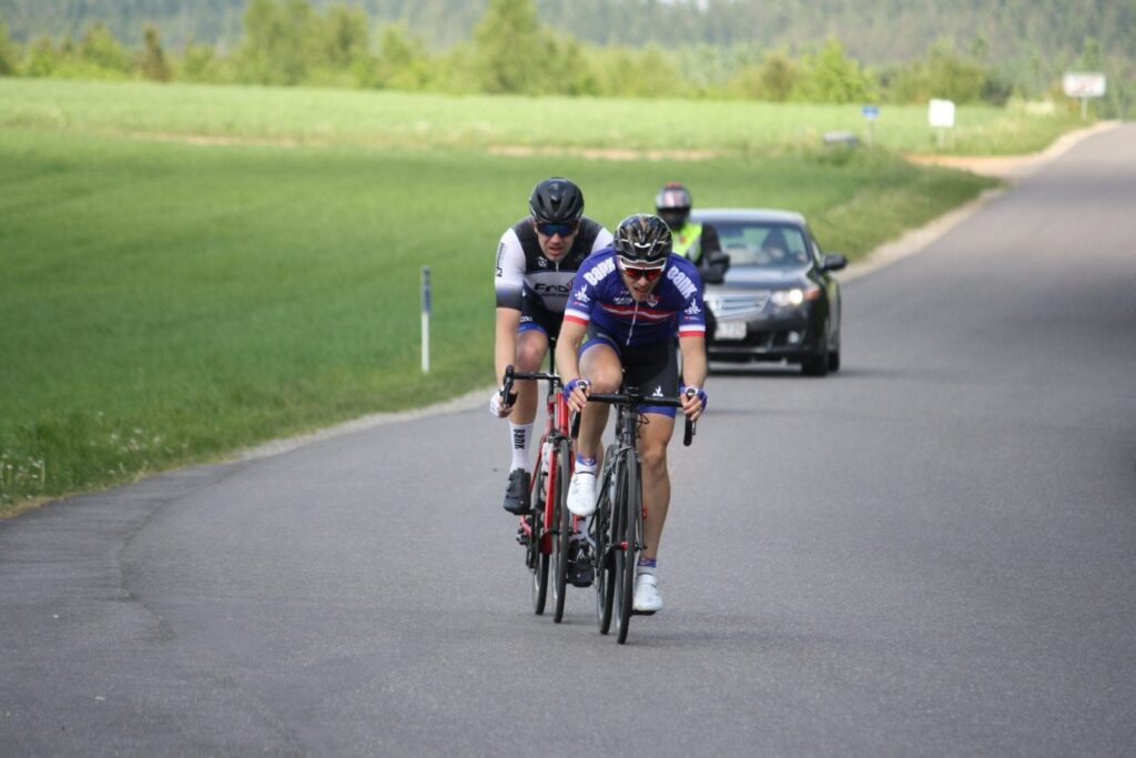 Stille og roligt udbyggede vi føringen, men da vi passerede Michelle, råbte jeg til hende, om hvor mange der var foran? Femten, tror jeg, svarede hun! Æv! Så var der næppe noget at køre om! Da vi ramte det lange modvindsstykke kunne jeg se en gruppe på 5-6 mand bag os. Vi havde måske 30 sekunder. Jeg snakkede kort med Sune, og min umiddelbare fornemmelse var, at vi ikke skulle køre all out, men bare holde den stram, da de nok ville hente os før eller siden. Så vi satte intensiteten en smule ned. Da vi 5-10 minutter senere var færdig med modvindsstykket kunne vi dog se, at de ikke var kommet sønderligt tættere på, så nu skulle den have fuld gas, da vi kørte ud på sidste omgang.