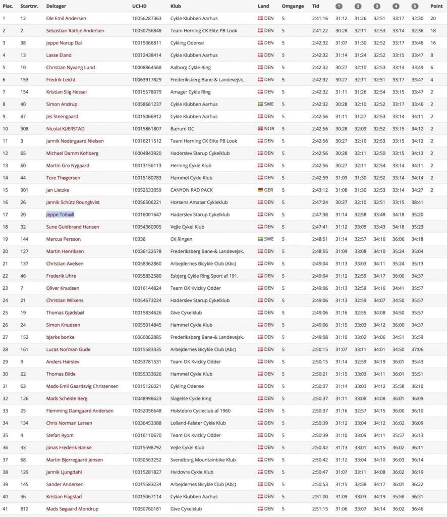 Vinderen af løbet blev Ole Emil Andersen, CK Aarhus, foran Sebastian Rathje Andersen, Herning CK Elite pb Look og Jeppe Norup Dal, Odense CK.