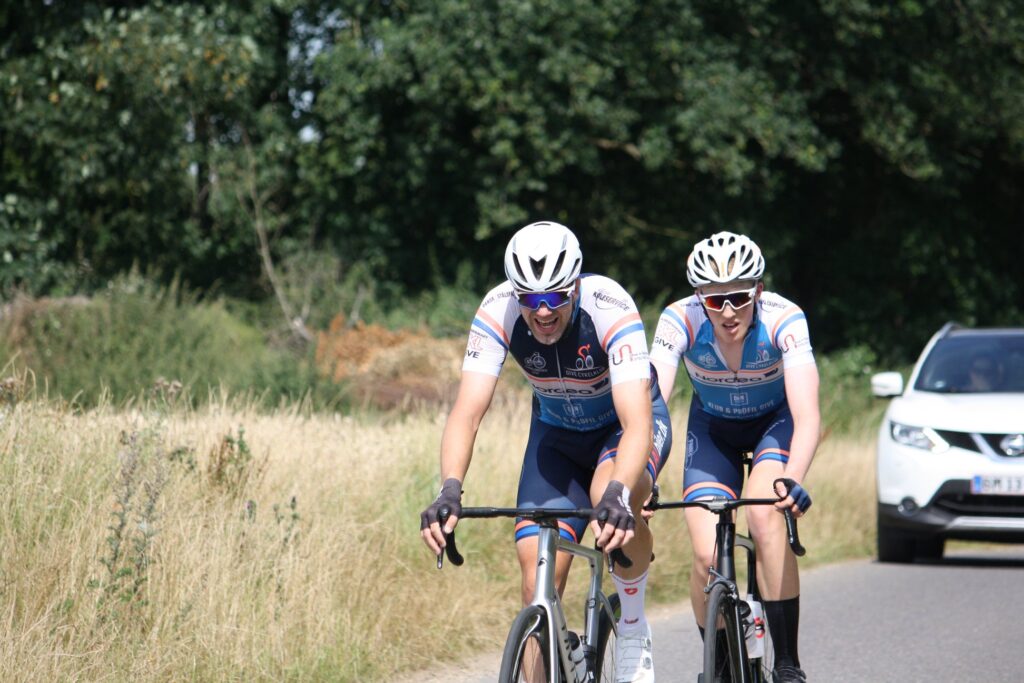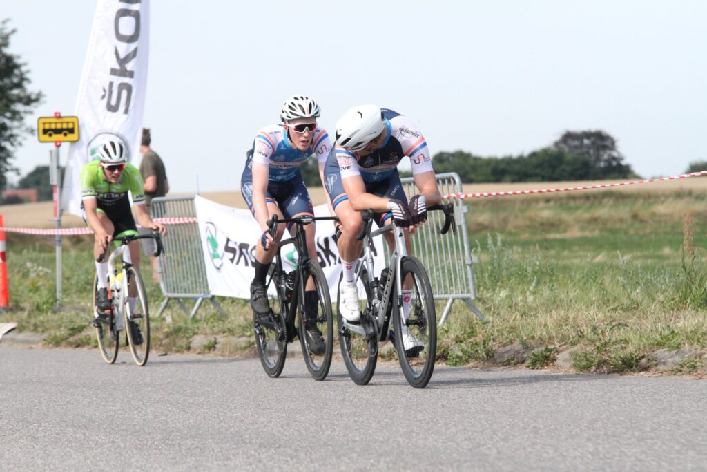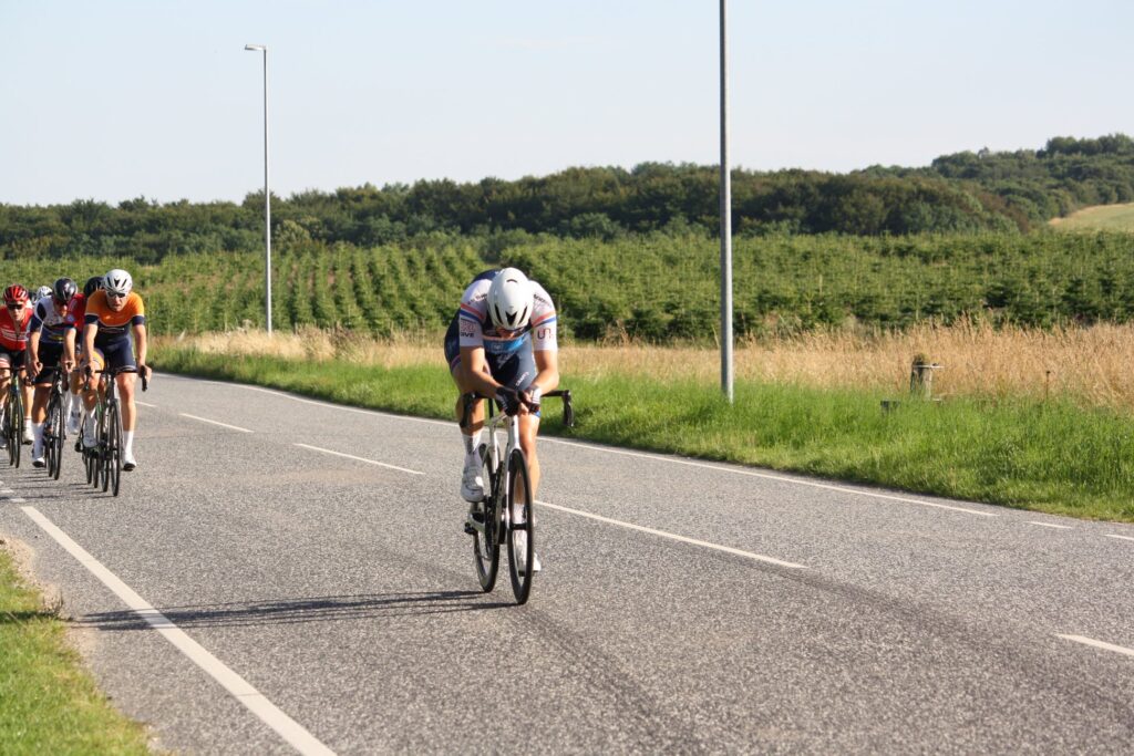 Det lykkedes også. Jeg husker ikke, at jeg overhovedet var med i noget angreb før vi ramte bakken ind mod opløbet – den samme bakke som fra enkeltstarten. Tempoet op over der, var ikke voldsomt, og på toppen faldt der ro på. Jeg kom bagfra, i venstre side, og da jeg kørte forbi Rasmus fik jeg ham guidet ind på mit baghjul, og kørte os frem. Skæbnen ville at der pludselig kom en åbning i venstre side af feltet, og jeg tænkte at jeg ville forsøge med et angreb. Den eneste rytter jeg fik med mig var dog Rasmus. Okay, det ville de nok ikke lade køre, men jeg tænkte, at jeg kunne bruge mine hjælperrolle til at presse dem lidt til at føre, mens Rasmus fik et lille free ride, så jeg lade mig ned over styret og kørte til. Ikke noget all out, men nok til at de skulle trykke hårdt i pedalerne for at lukke.