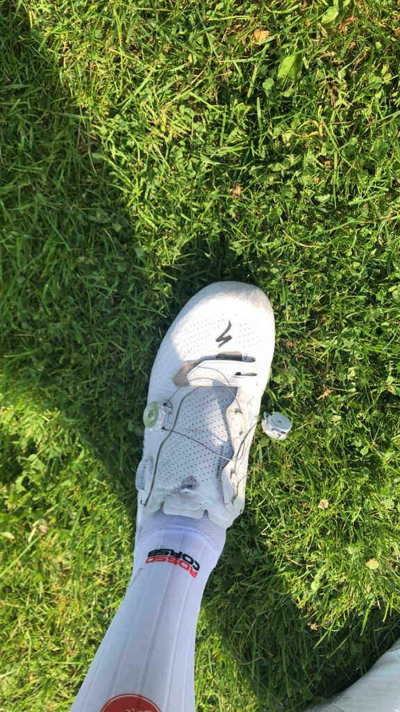 Jeg prøvede at fikse det mens jeg kørte, men jeg kunne ikke få den fast igen, og det føltes som at køre med en klipklap på foden i stedet for en cykelsko. Jeg mistede fart ved at skulle bøvle med det, men kunne ikke træde og hive igennem, så det var noget rigtig lort. Jeg indså, at jeg måtte stoppe for at fixe det. Jeg hoppede af prøvede i panik at få BOA-spænden på, men jeg kunne ikke. Jeg kiggede op af vejen, og kunne se at feltet allerede nu i hvert fald havde 40-50 sekunder og mere eller mindre var ude af syne. Det var slut.