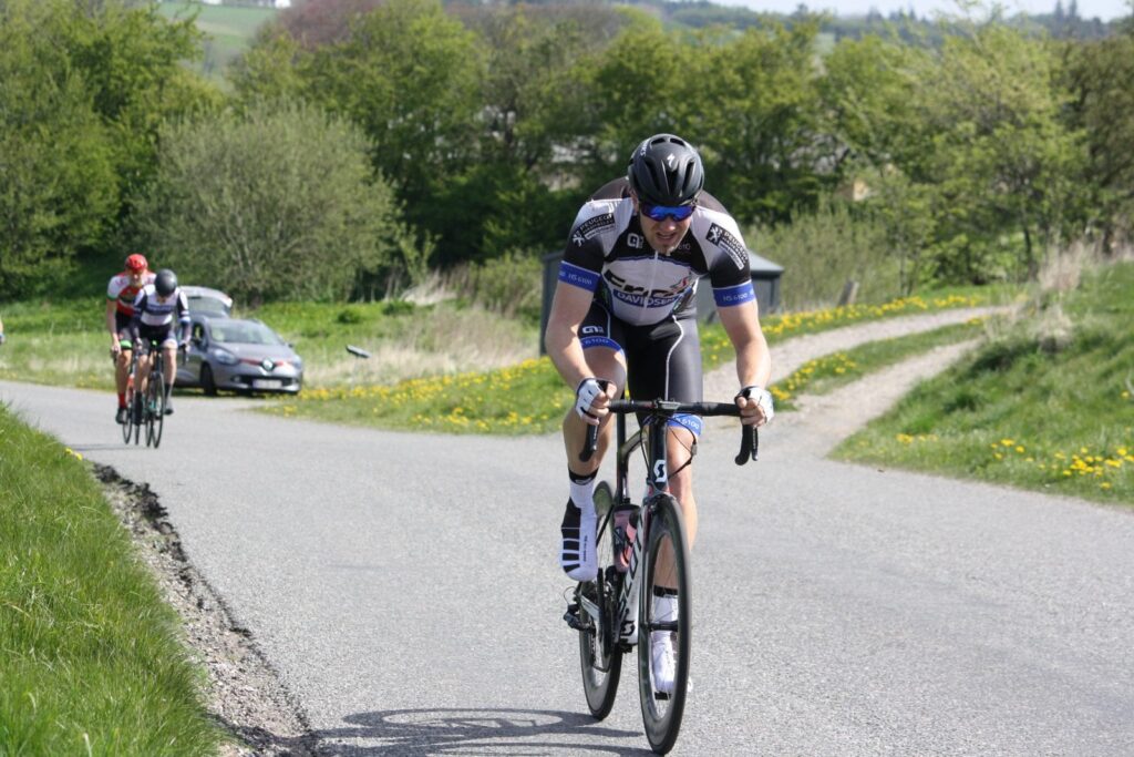 Løbet blev skudt i gang, og det hele startede som lyn og torden! Angreb fra både Nikolaj Møller og Christian Gorm, der nok begge havde noget at revanchere fra dagen før! Der var virkelig knald på, og det gjalt om at holde sig til. Derfor blev den ide om offensive kørsel også lagt lidt på is de første par kilometer – jeg skulle lige ind i løbet. Derfor blev jeg bare på hjul, og holdte mig til så godt jeg kunne. Jeg var ikke ret presset, men omvendt var der heller ikke råd til at lege supermand!