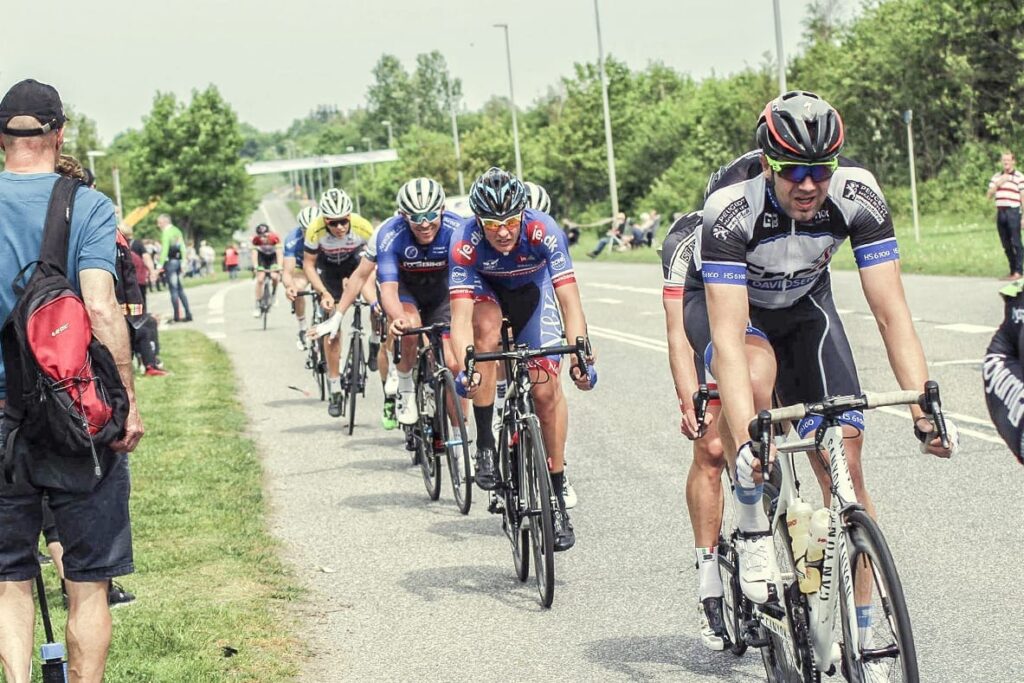 Da vi ramte et industrikvarter ca. 2,5 kilometer før omgangen sluttede blev der pludselig kørt seriøst sidevind, og jeg kunne se mig selv ligge alt for langt tilbage, da ca. 15-17 mand rev sig fri. Okay, det var seriøst, med ca. halvdelen af feltet der kunne risikere at sejle væk! Jeg tog en beslutning. Jeg turde ikke satse på at andre kørte dem ind, så jeg rykkede ud i sidevinden og hamrede afsted! Der var startet en vifte i vores gruppe, som jeg passerede med høj fart og pludselig lå jeg fanget i ingen-mands-land. Der var ingen vej tilbage herfra, og efter hårdt jagt på 1,5 minut, fangede den dem og gispende efter vejret kunne jeg se at hullet kun voksede herfra. Jeg led meget lige nu, og brugte i hvert fald 3-4 minutter på hjul, før jeg begyndte at bidrage en smule.